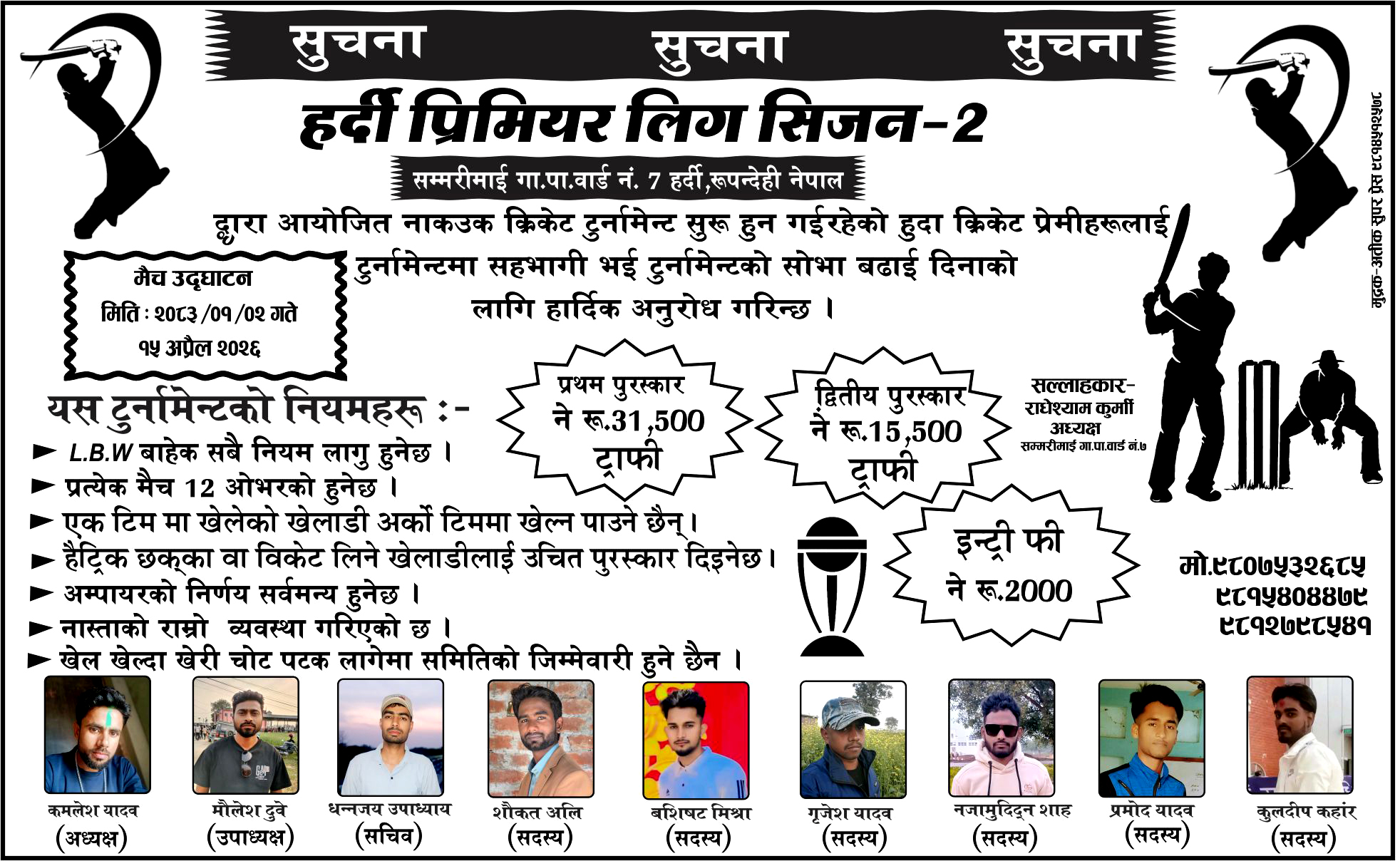 सम्मरीमाई गाउँपालिका वडा नं. ७ हर्दीका युवाहरूको संयुक्त पहलमा हर्दी प्रिमियर लिग (HPL) सिजन–२ क्रिकेट प्रतियोगिता आयोजना गरिने भएको छ। प्रतियोगिताको उद्घाटन २०८३ साल वैशाख २ गते हुने भएको हो ।