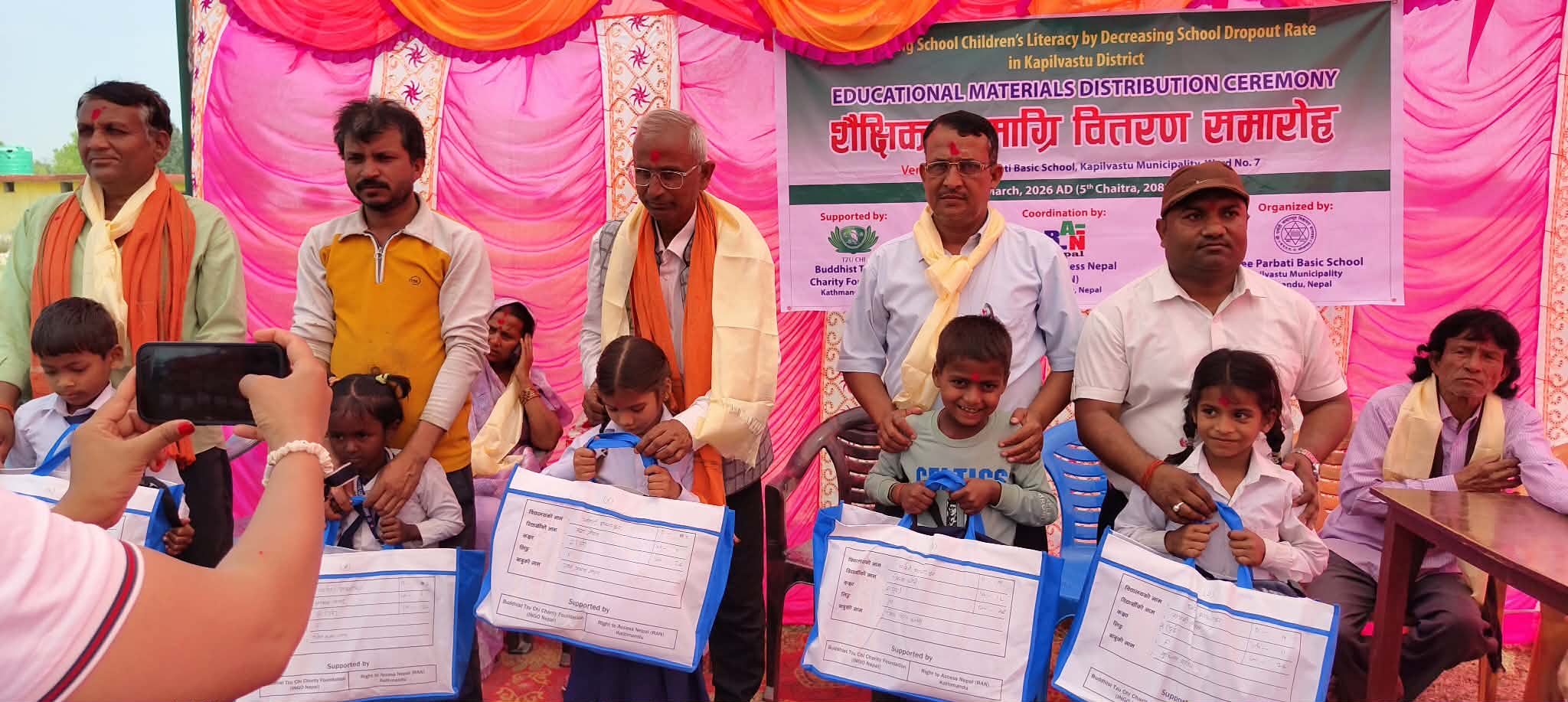 कपिलवस्तु नगरपालिका -७ बरगदवामा स्थित श्री पार्वती आधारभूत विद्यालयमा RAN संस्था द्वारा कक्षा १ देखि ५ सम्मको बालबालिकालाई शैक्षिक सामग्री तथा उनीहरूका अभिभावकलाई खाद्यान्न वितरण गरिएको छ ।