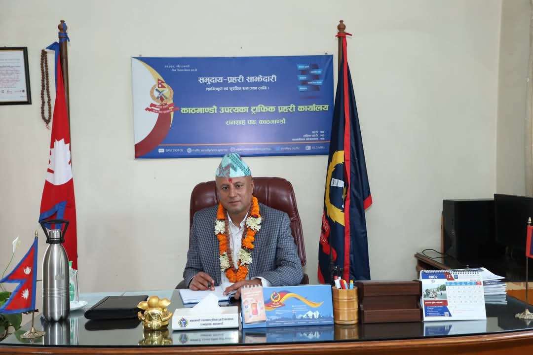 काठमाडौं, जेठ १९ गते – काठमाण्डौं उपत्यका ट्राफिक प्रहरी कार्यालय, रामशाहपथका नयाँ प्रमुखको रुपमा वरिष्ठ प्रहरी उपरीक्षक (एसएसपी) नवराज अधिकारीले आजबाट पदभार ग्रहण गर्नुभएको छ।